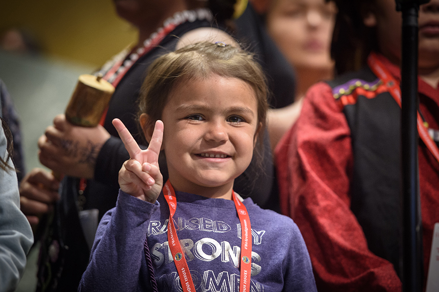 The group Sjisäwishék “Keeping the fire strong,” indigenous girls of the Onondaga Nation, Haudenoaunee Confederacy, perform at the opening of the eighteenth substantive session of the Permanent Forum on Indigenous Issues themed “Traditional knowledge: Generation, transmission and protection.”